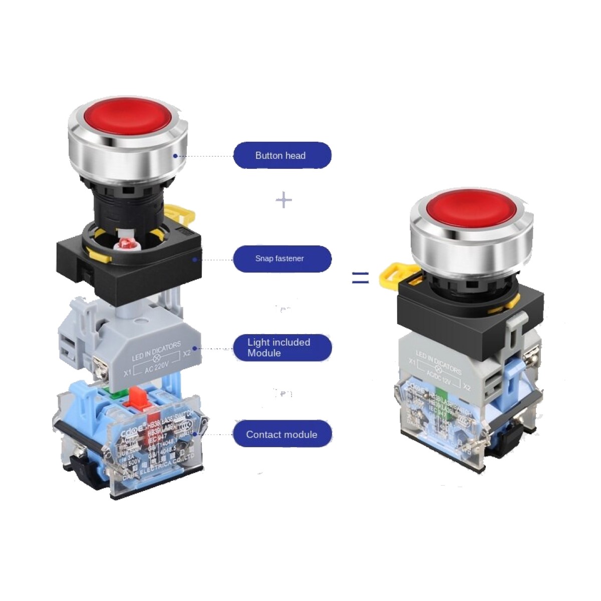 Este interruptor es compatible con orificios de 22mm y 30mm, para 22mm el capuchón del botón sobresale mientras que para 30mm el capuchón queda escondido. Es un botón que tiene la posibilidad de ser iluminado mediante foco piloto LA38-LED (led se vende por separado) por lo que es excelente para indicar el estado del botón o para indicar la acción a tomar.
