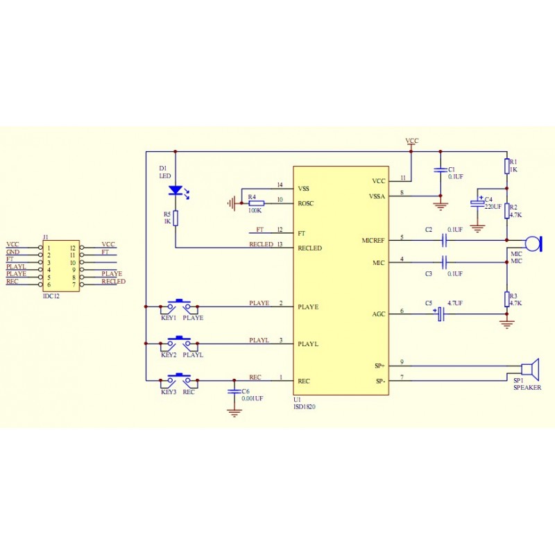 4. MIC – La entrada de micrófono transfiere su señal al preamplificador del ISD1820. Cuando se grabe hay que tener el micrófono en dirección a la fuente sonora.