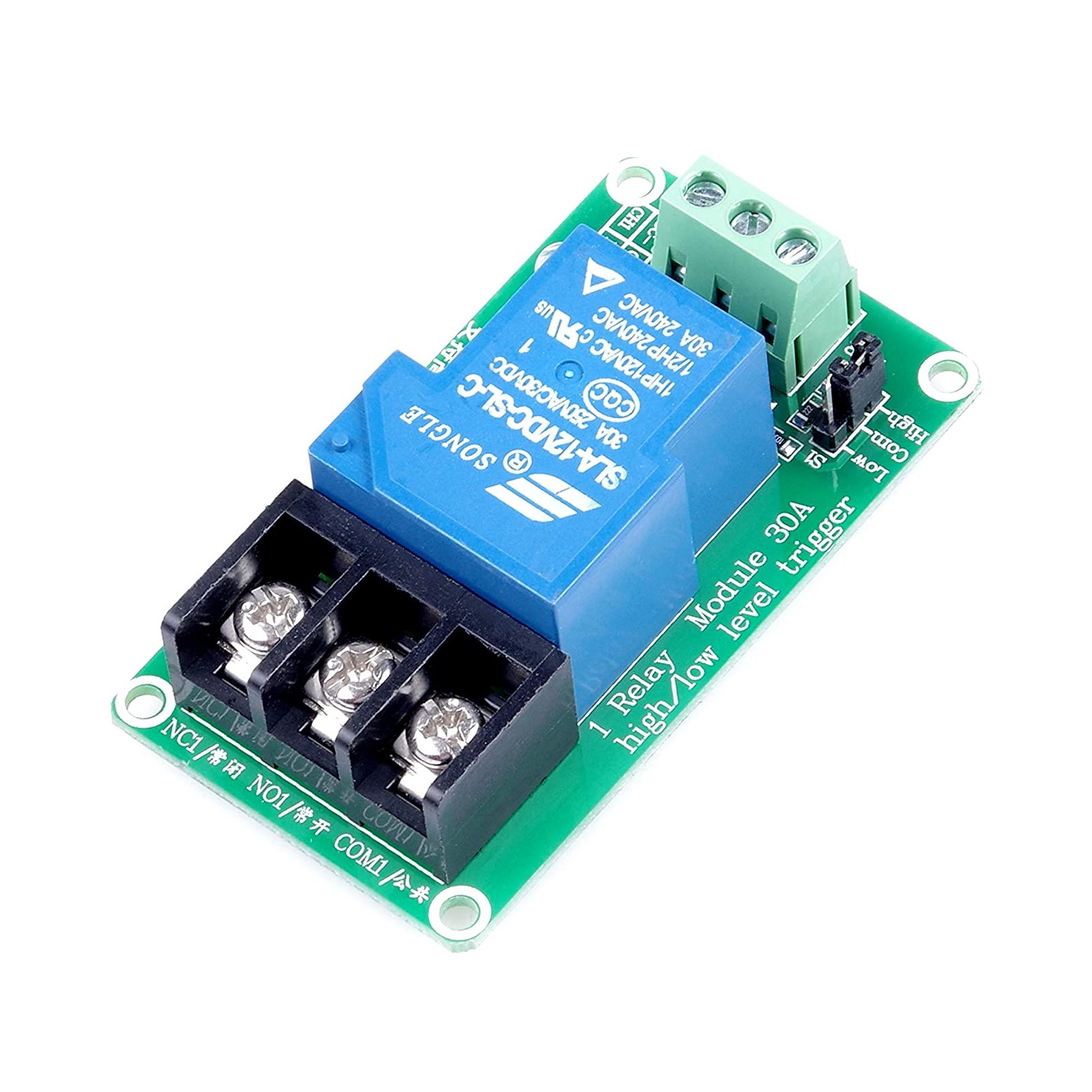 Por ultimo el modulo relay de 12V 30A cuenta con un jumper para cambiar la señal de disparo (trigger) y que el relevador se pueda activar con un nivel bajo o un nivel alto según se requiera.