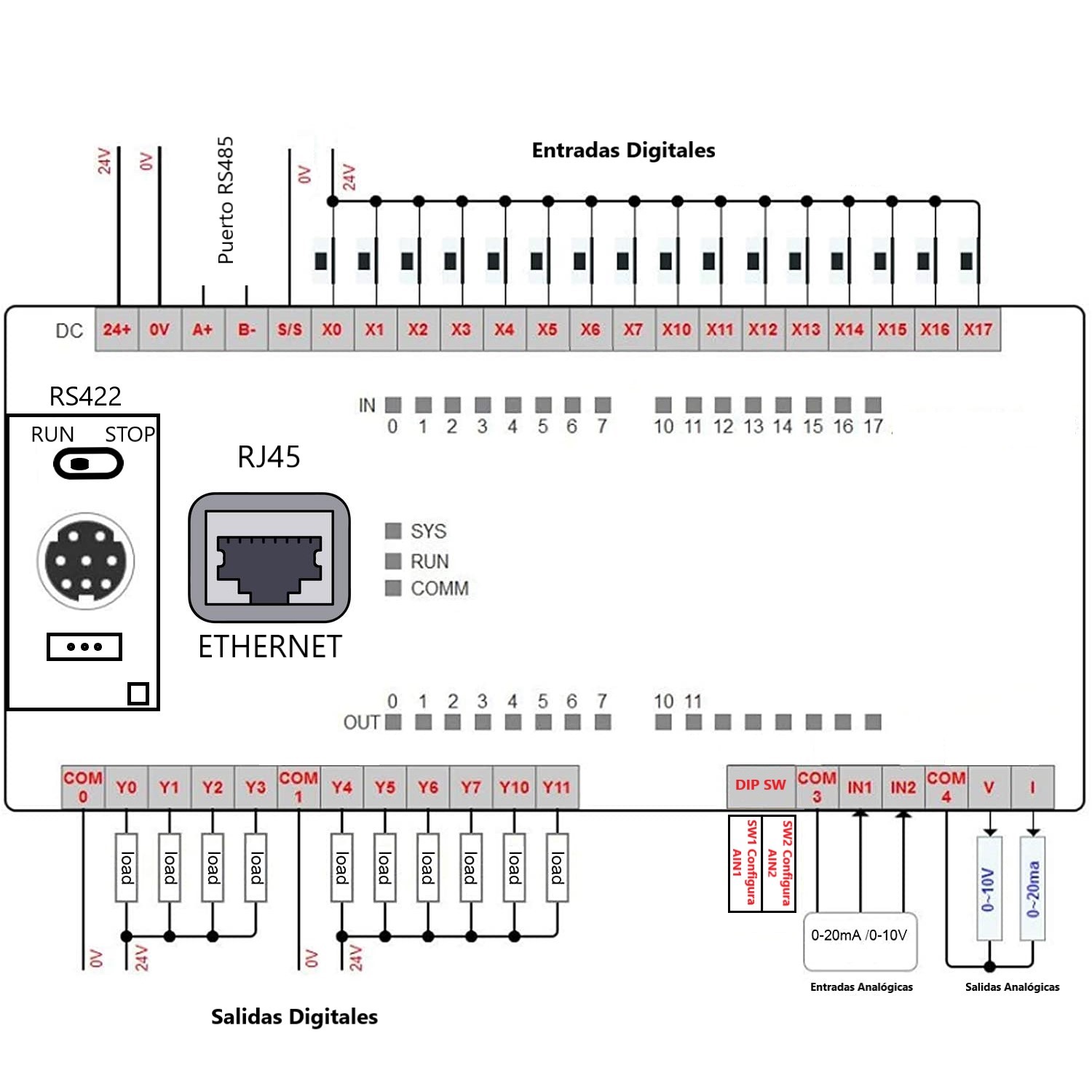 Este PLC tambien incluye un puerto ETHERNET RJ45, que soporta comunicación MODBUS TCP, el mismo puerto es compatible con el software Works2 o GxDeveloper para programarlo directamente.