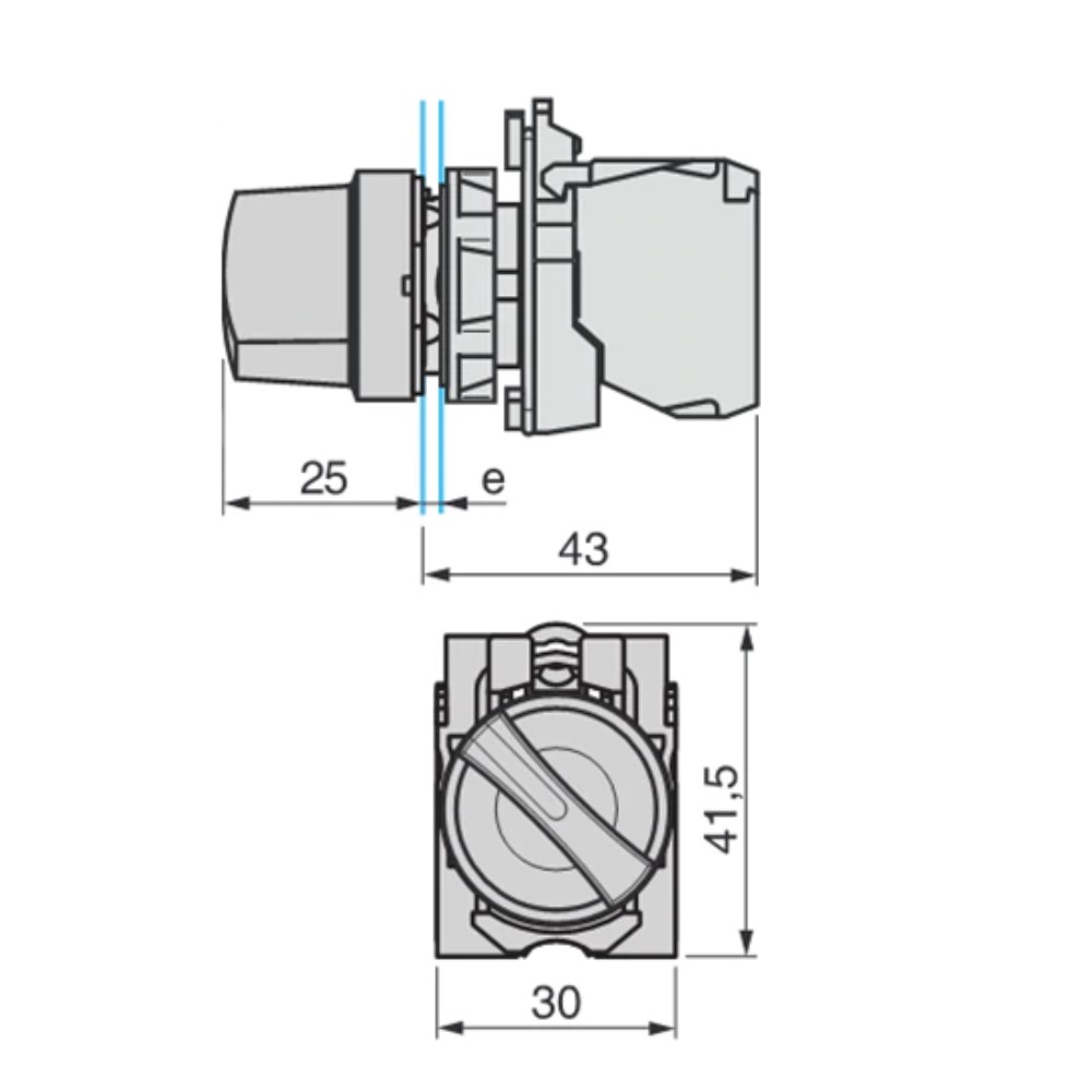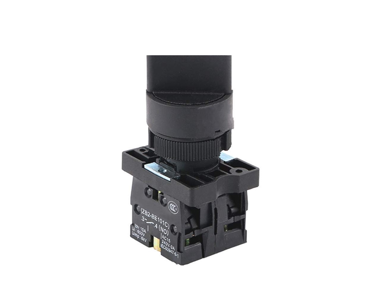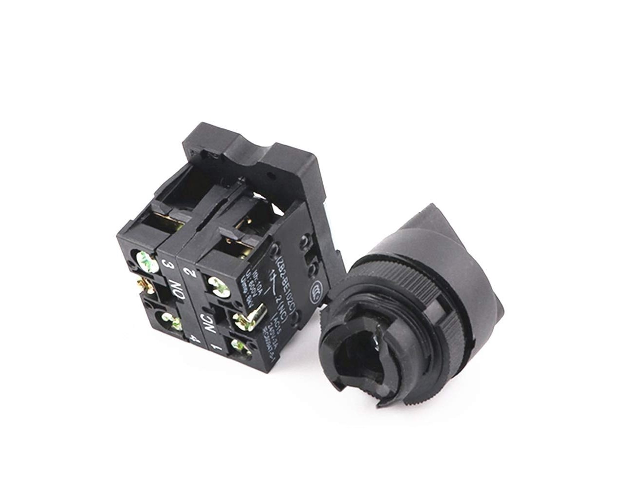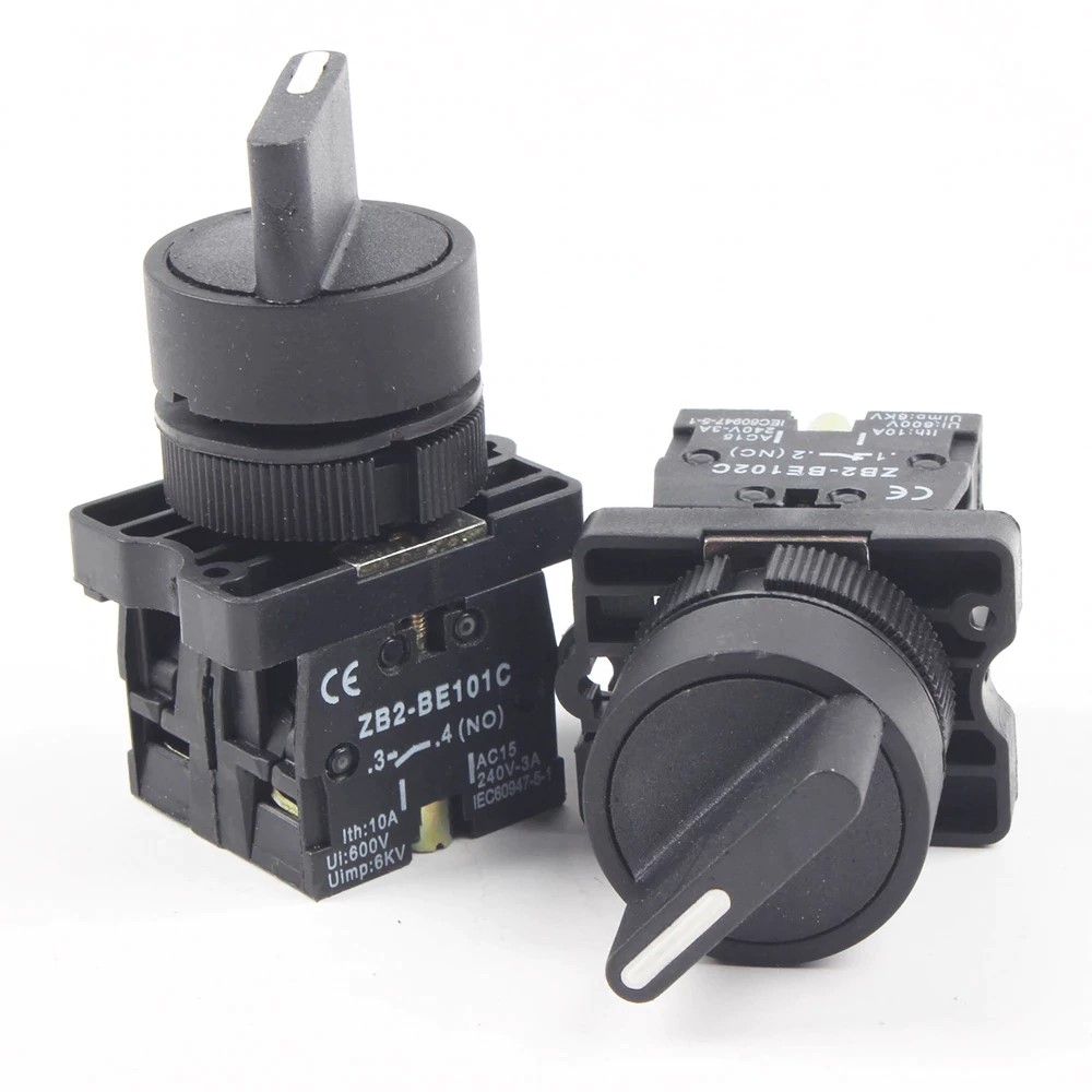 El switch selector XB2-ED33 cuenta con dos contactos auxiliares tipo ZB2-101C NO . El selector no cuenta con resorte de retorno, por lo que si giras la perilla a cualquier lado permanece en esa posición hasta que se regresa manualmente.. Se puede utilizar para activar contactores, arrancadores, electro válvulas, entre otros aparatos eléctricos