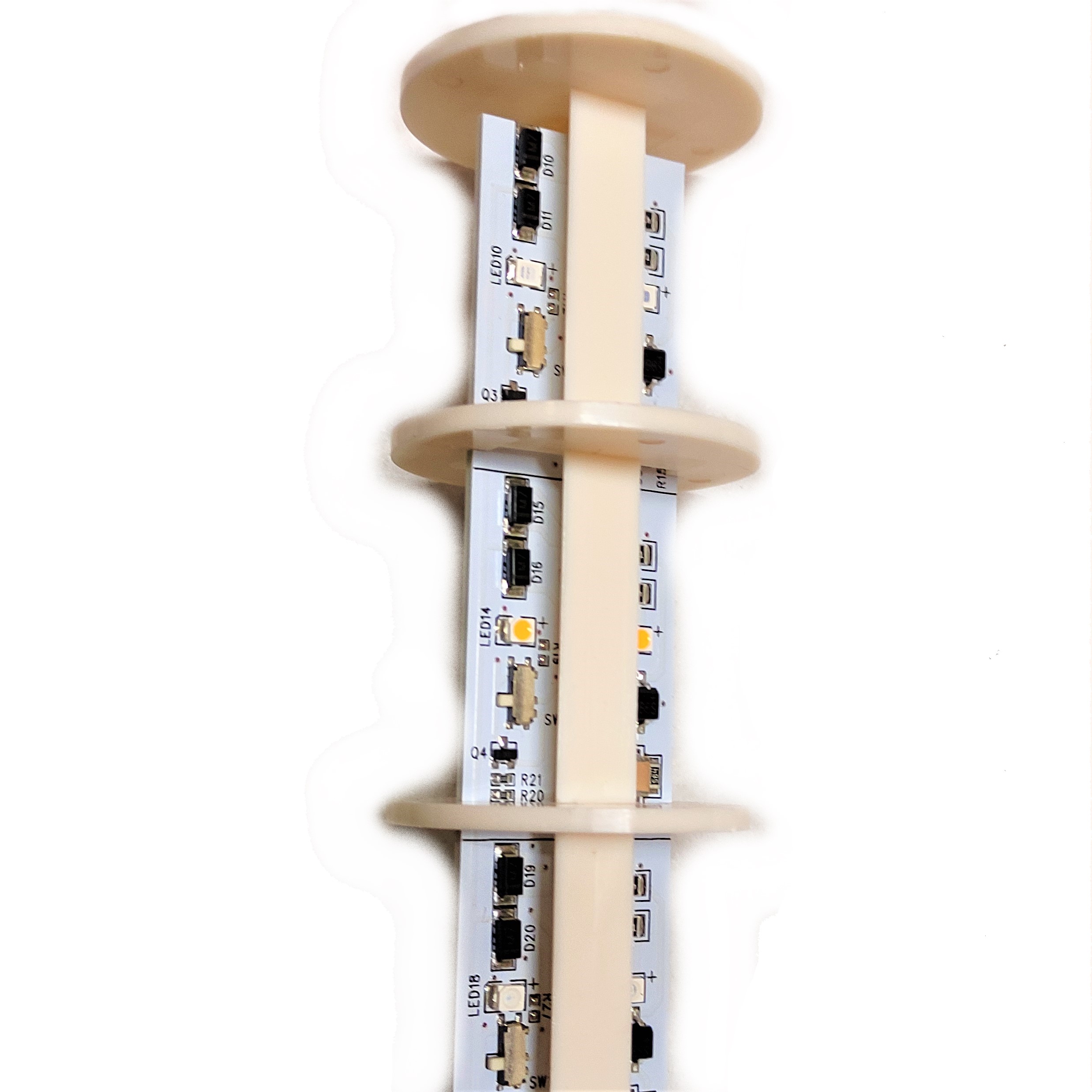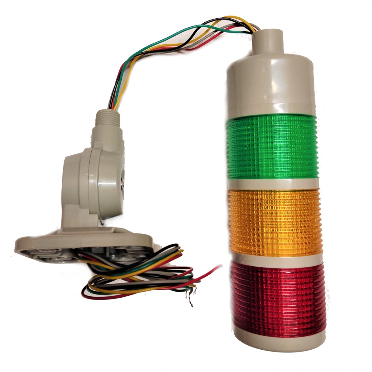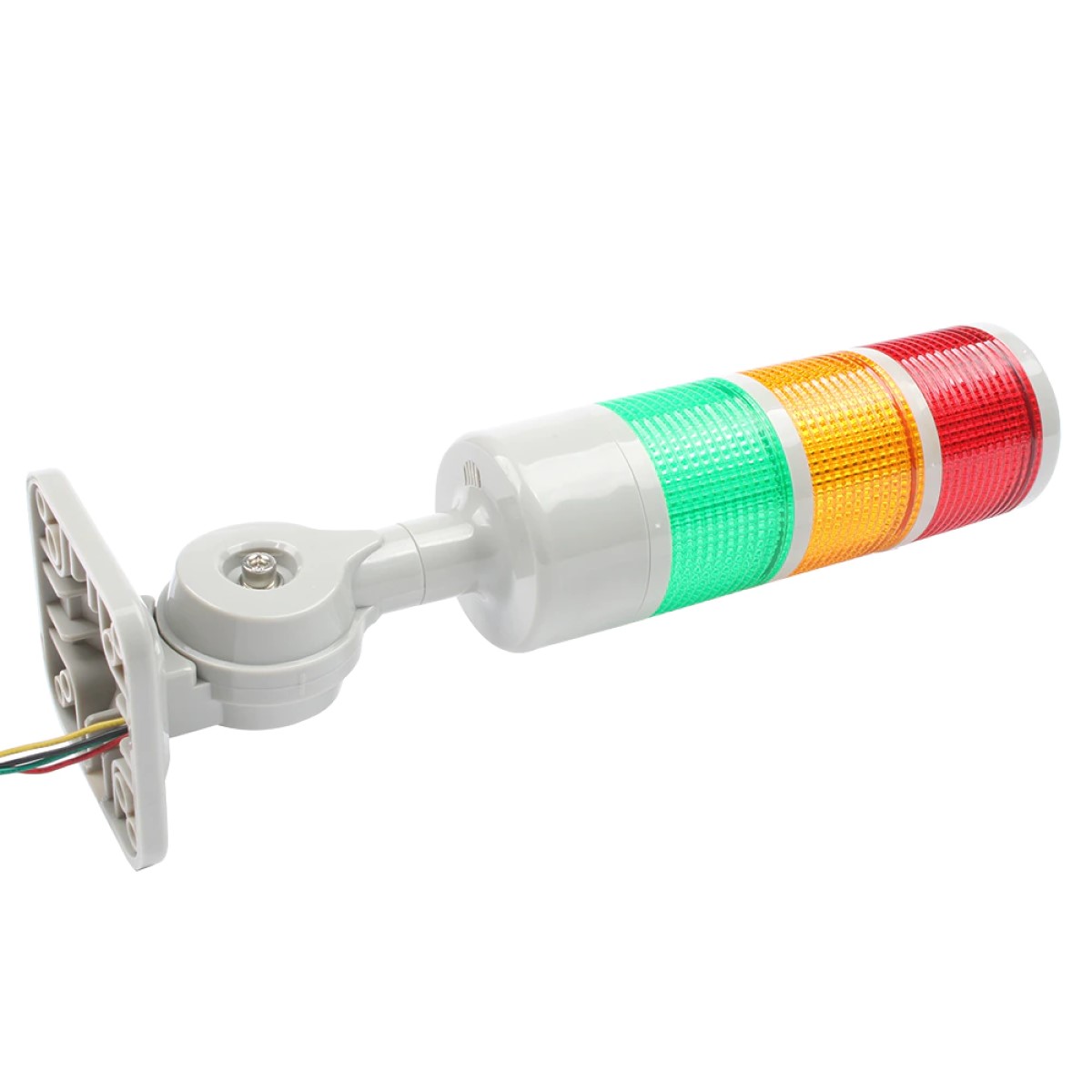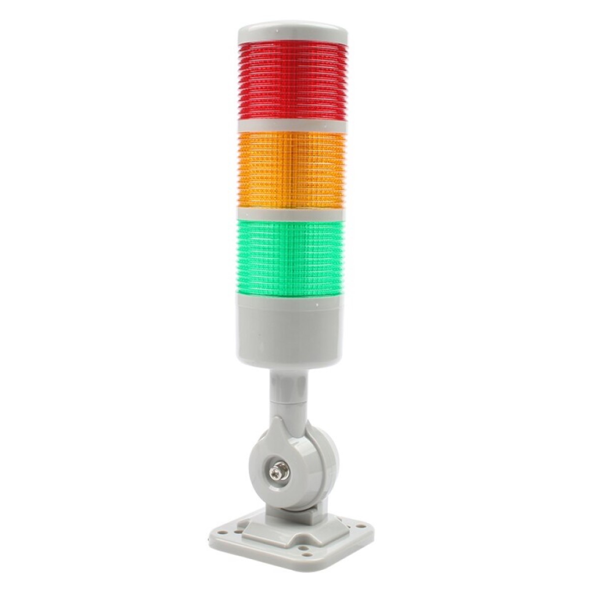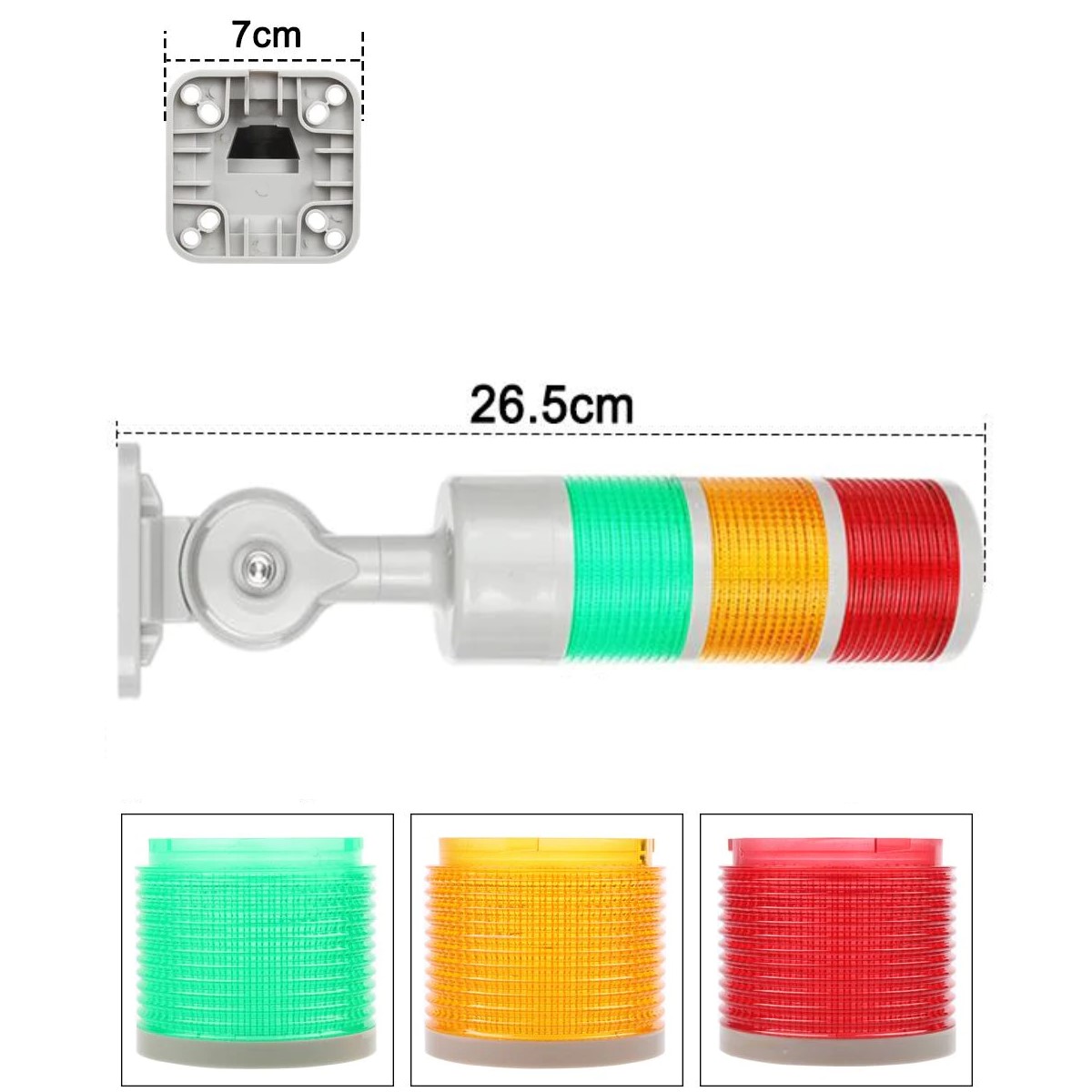 Cuenta con 3 luces verde, amarilla y roja, tambien incorpora un zumbador o buzzer de 60db que si bien no es un sonido fuerte es suficiente para alertar, cuenta con un soporte de plástico que se puede inclinar hasta 180° para su fijación en muros, gabinetes o para ser montado en maquinaria.