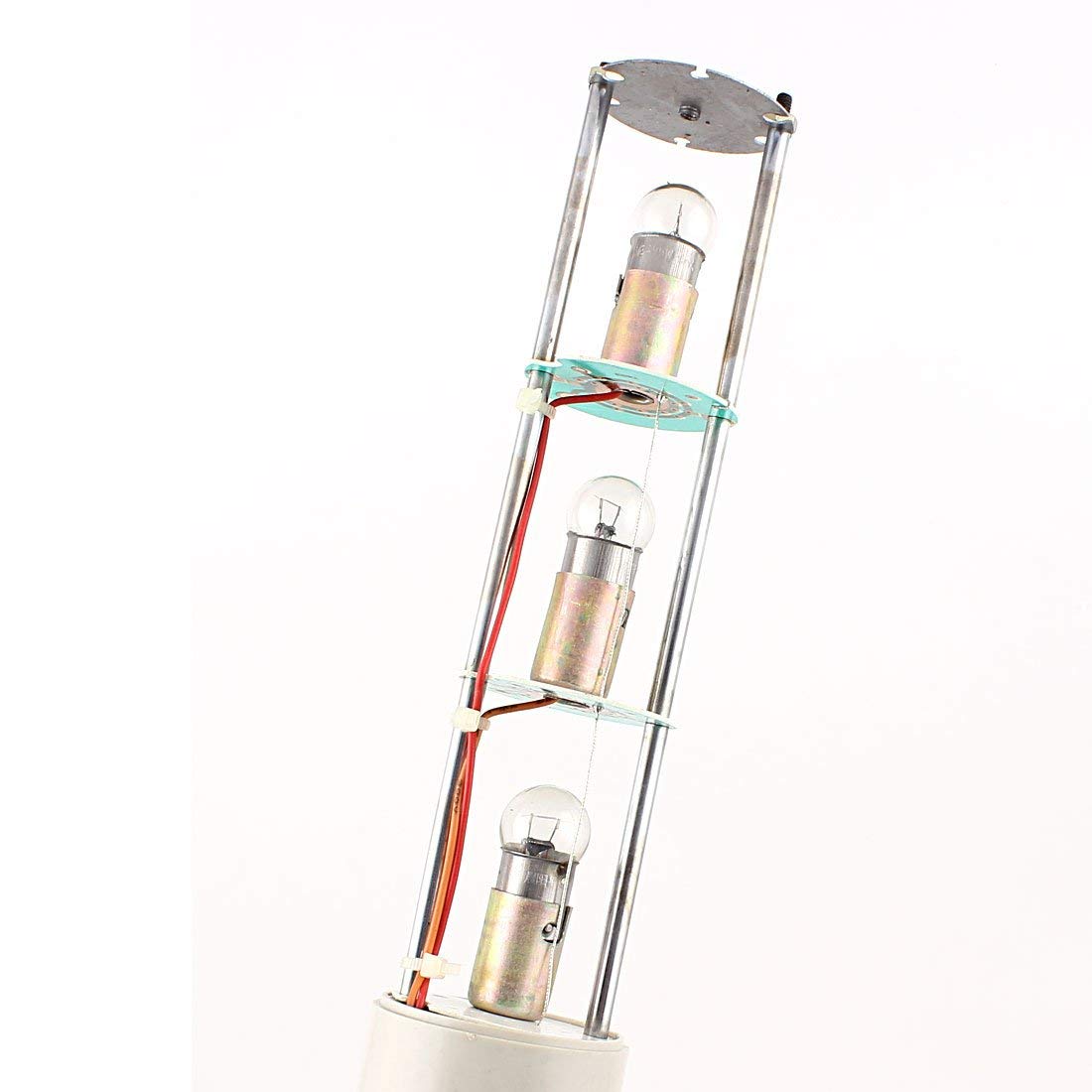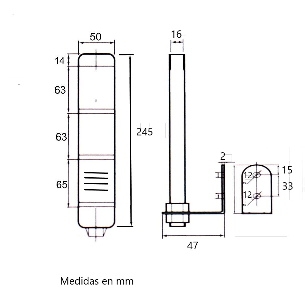 Cuenta con dos luces una Verde y una Roja ademas de un poste metálico de 245mm así como tuercas y un soporte en angulo para su fijación en muros o para ser montado en maquinaria.