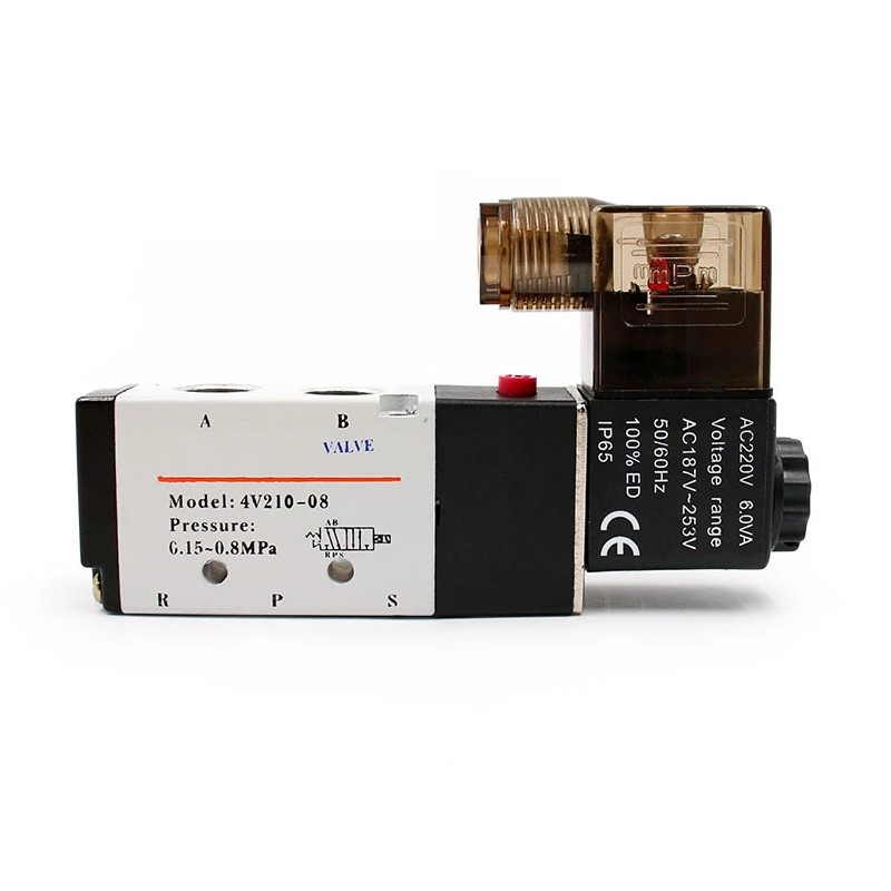 La 4V210-08-220VCA es una válvula eléctrica o válvula solenoide de 5 vias 2 posiciones con puertos de 1/4″ y escapes de 1/8″ , puede ser alimentada con 220VCA.