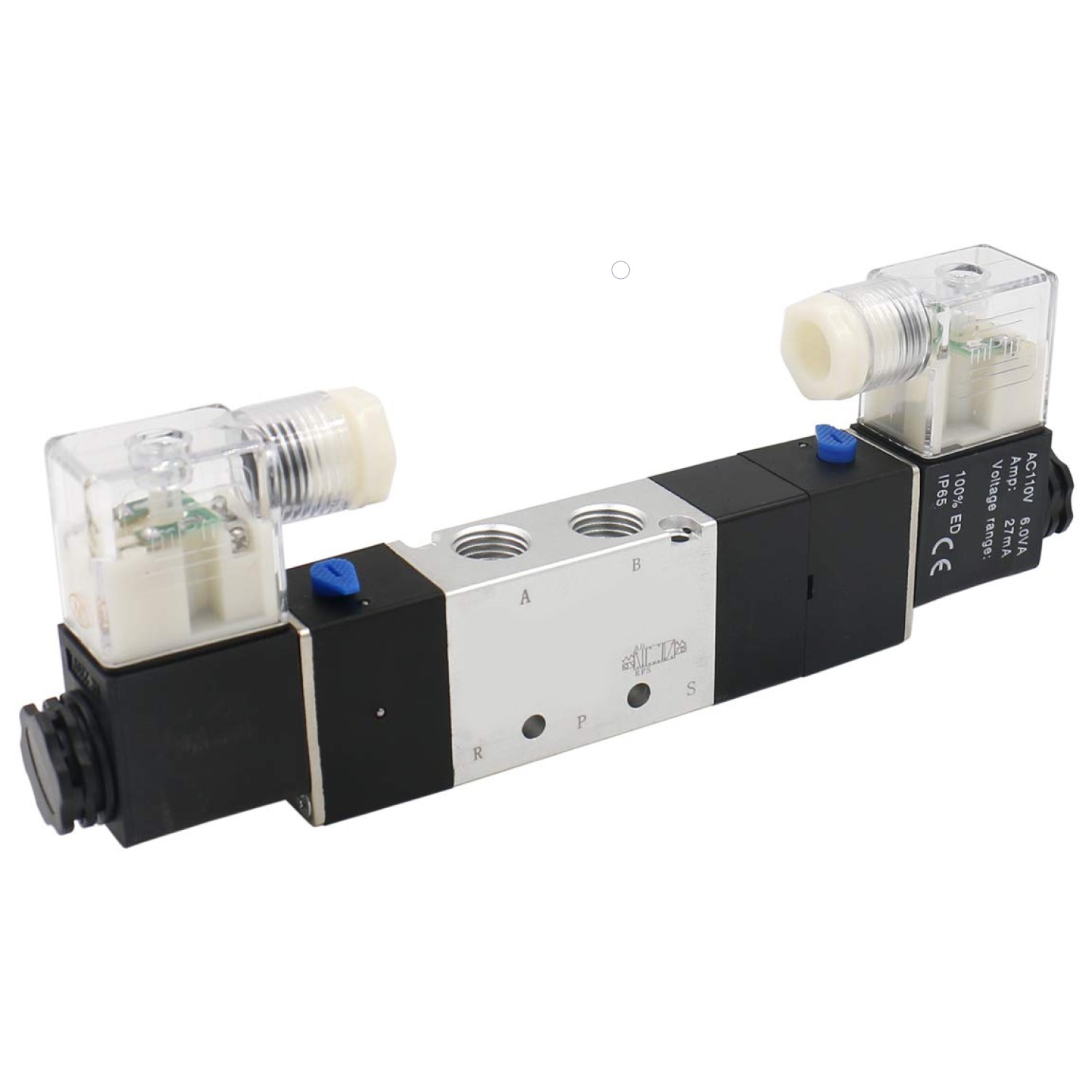 La 4V230C-08-120VAC es una válvula eléctrica o válvula solenoide de 5 vias 3 posiciones con puertos de 1/4″ y escapes de 1/8″ , puede ser alimentada con 120 VCA.