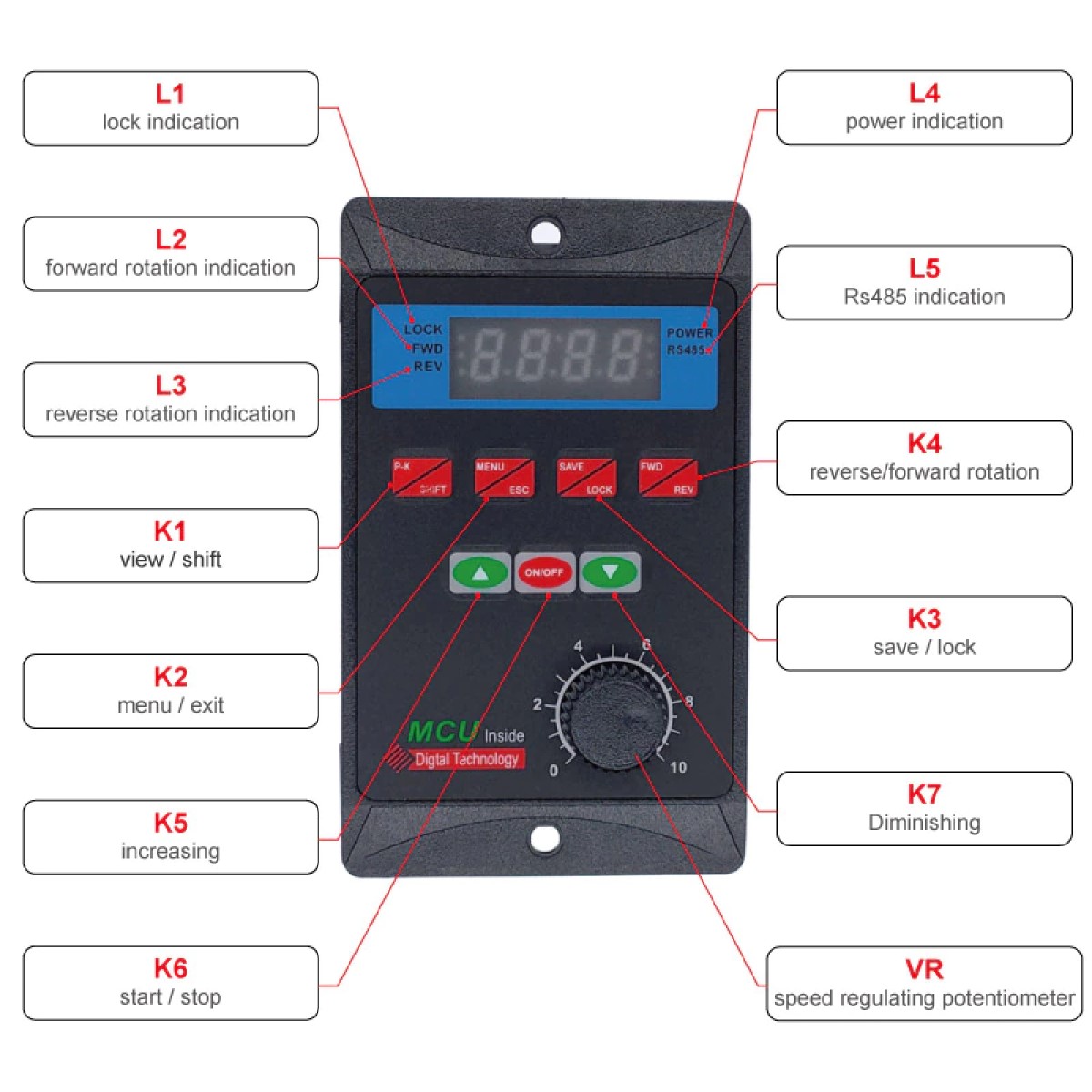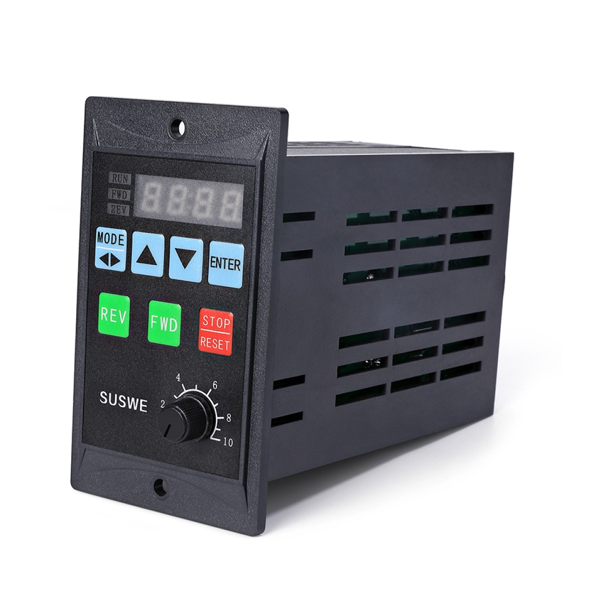 Control de Velocidad. Se puede variar la velocidad mediante el panel de control integrado por medio de la perilla o mediante potenciómetro externo que se debe conectar en sus bornes de conexión asignados.